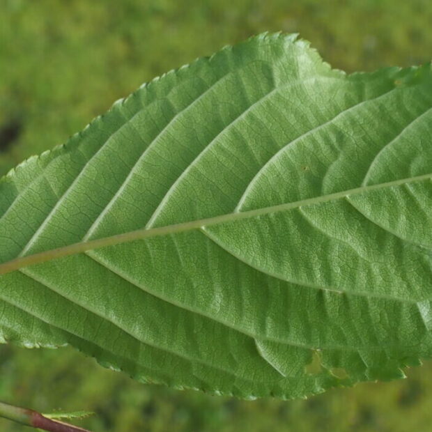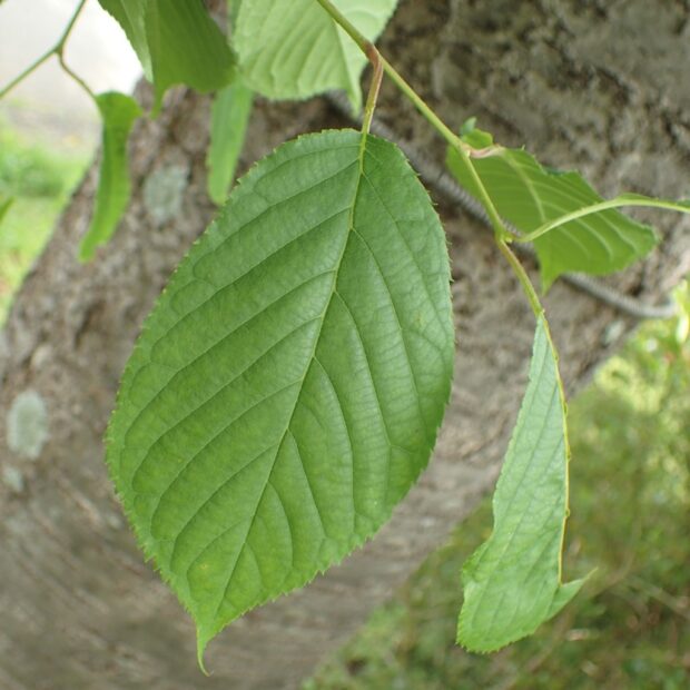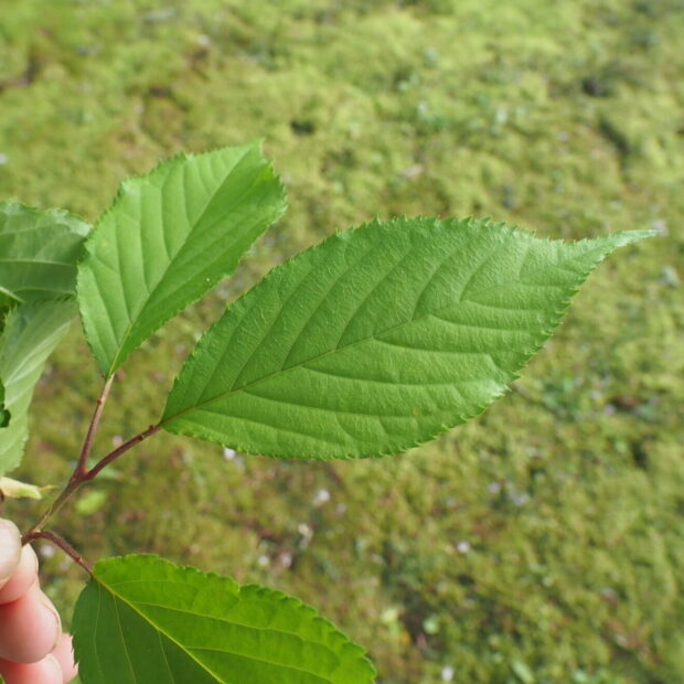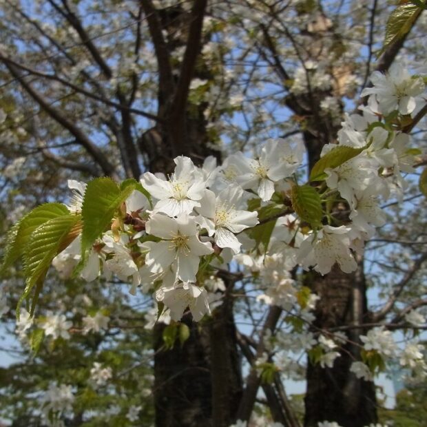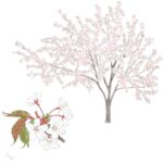 4~5月ごろに葉と花が同時に開きます。 サクラの仲間の中でも全体的に枝がスッとのびて若木の時から形が整い、 枝が45度以上、 上を向いて付きやすい木です。 15~20mほどまで大きくなります。 ヤマザクラみたいに若葉が赤くならず、 新緑の時期は全体的に緑色をしています。