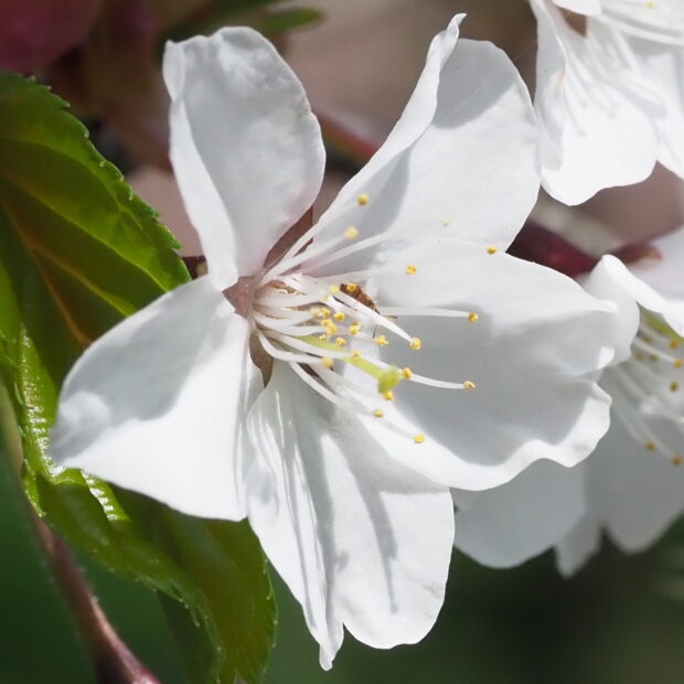 葉が出る頃に小さめの白っぽい花が咲く様子が、 霞がかかったようだということでカスミザクラと名付けられました。