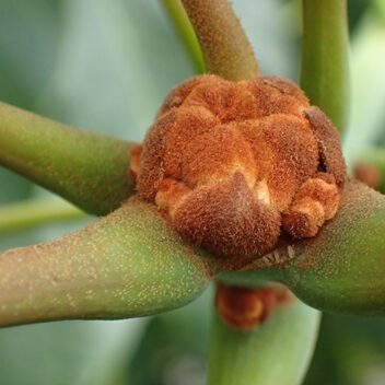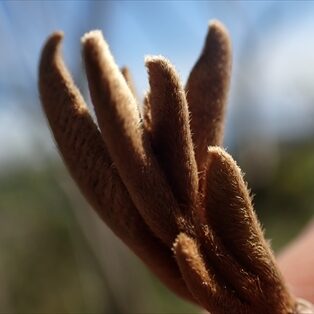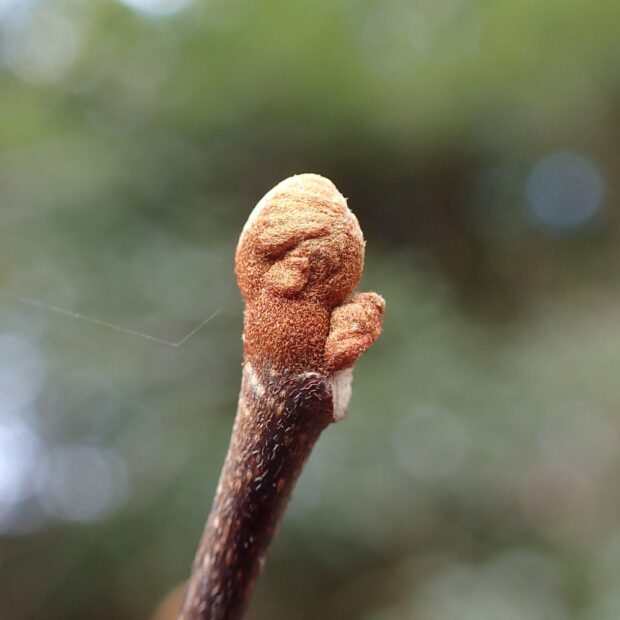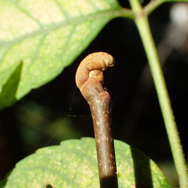じゃんけんのグーの形をしています。 正体は、 茶色い毛がもっさりと生えた幼い葉っぱです。