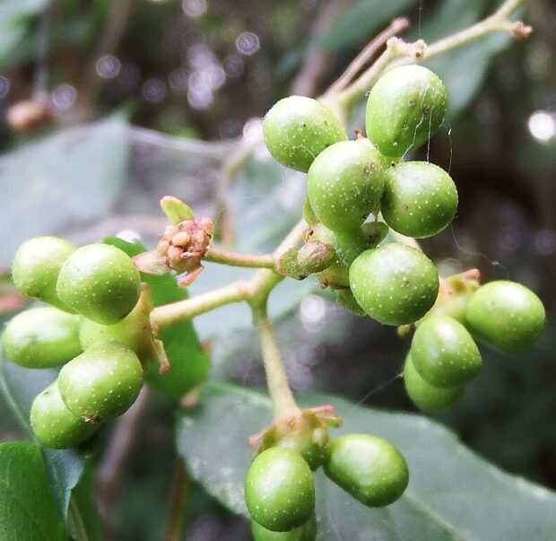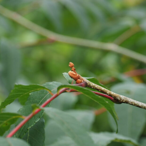 苦い木ですが、 このタマバエは苦くてもヘッチャラなのでしょう、 虫こぶの中でニガキを食べて育ちます。 実もとても苦いですが、 サルが食べるとのことです。