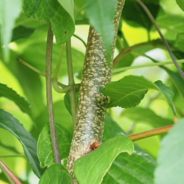 樹皮は色に幅があり、 茶色がかった灰色や、 紫っぽいこげ茶色などがあります。 若い枝は赤から灰色に変わり、 白い模様が目立ちます。