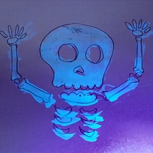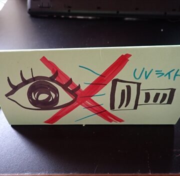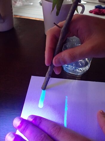 樹液はUVライトを当てると光るので、 絵を描いてみてください!蛍光剤が入っていて紙そのものが光ってしまう再生紙などはダメです。 子ども用のUVライトはシークレットペン、 スパイペンを使うと安価なのでおすすめです。
