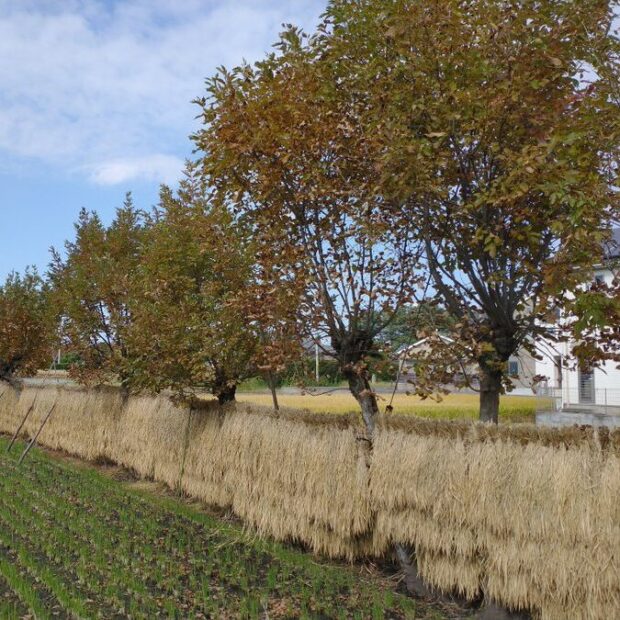 稲架木を使うことにより収穫した稲をより高く干すことができ、 乾燥が早まったと考えられます。 圃場整備やコンバインの普及で、 今ではほとんど姿を消してしまった風景です。