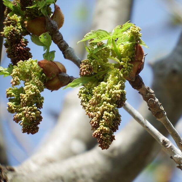 花びらが無く、 茶色くて地味です。 おしべだけが付く木と、 めしべと仮おしべ(おしべっぽいもの)が付く木があます。