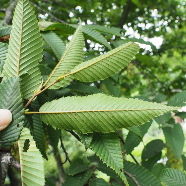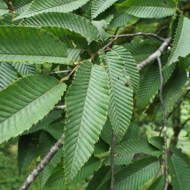 葉の側脈は20~24対もあり、 これでもか!と言わんばかりに、 きっちりと平行に脈が刻まれています。 シデの仲間の中でも細長くて大きな葉です。