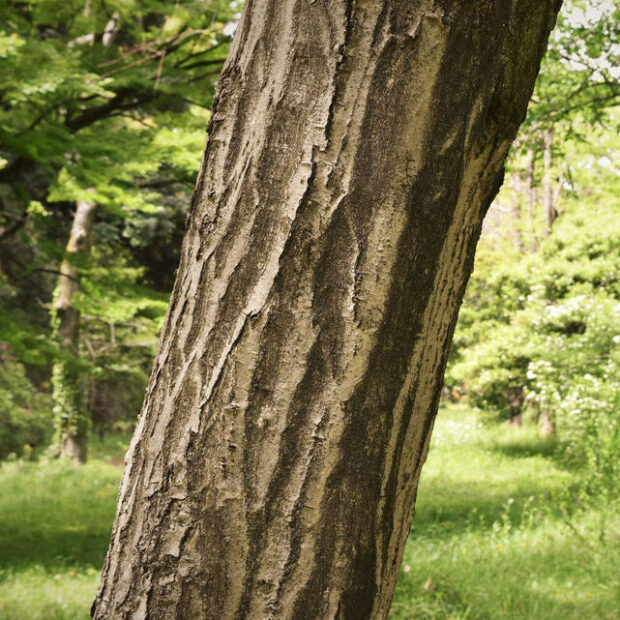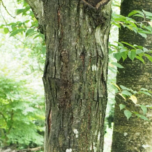樹皮は全体的に黒っぽい茶色です。 若い枝はスベスベですが、 大きくなるとミミズばれのような模様が出来て、 老木になるとさけて白っぽい筋が目立ちます。
