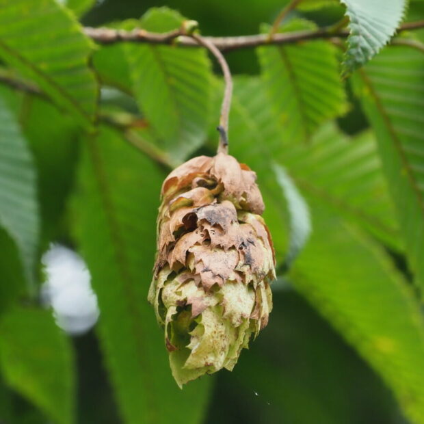 大きな実に見えるものは、 天狗のうちわのような形をした小さな葉のようなもので守られた小さい実が、 縦に連なって付いたものです。 遠くから見るとビールのホップとよく似ており、 ボリュームがあって目立ちます。 10月頃に茶色に熟し、 羽付きの実が一つずつ風に飛ばされて種まきされます。