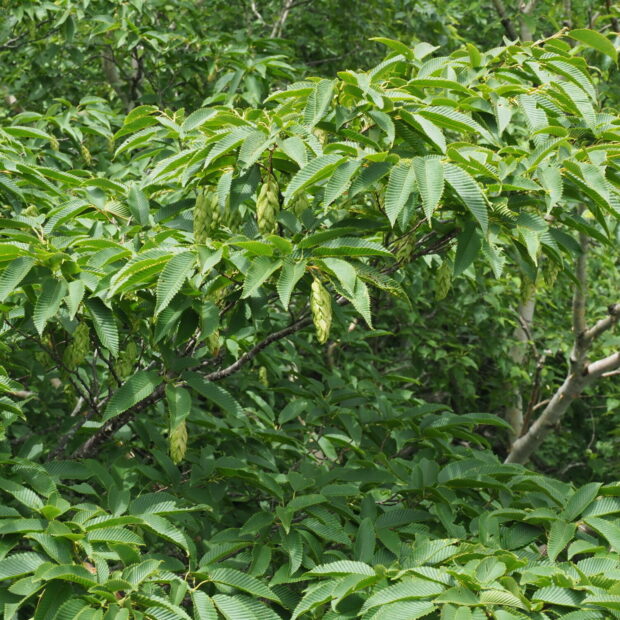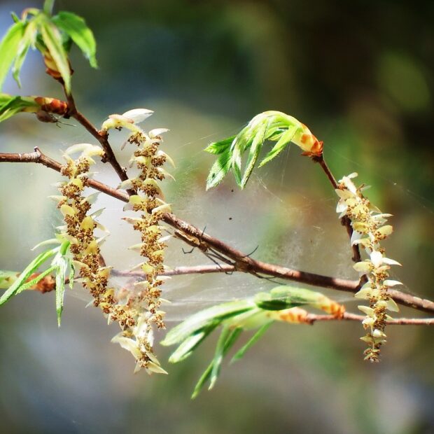 4月ごろ若葉が開くと同時に、 うすい黄色ぽい雄花と雌花を同じ木に咲かせます。 長い花は雄花の集まりで、 枝先に葉にまぎれて付く短い花は雌花の集まりです。