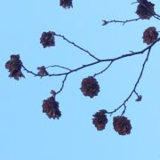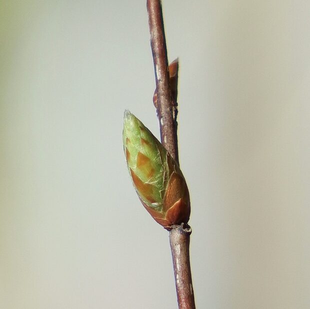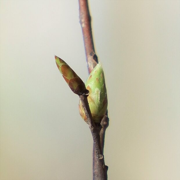 先がとんがり、 しずくの様な形をしています。 全体的に緑色で大きい冬芽は雄花、 ほっそりした冬芽には、 葉または雌花が入っています。