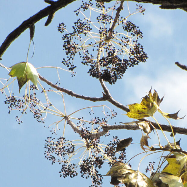 集まって付く実のシルエットは花と同様、 線香花火を連想します。 5㎜ほどの球形で、 秋の終わりに黒く熟します。 冬、 鳥達に食べられた実の中の種は、 鳥のフンと一緒になって遠くに落とされ、 芽吹きます。