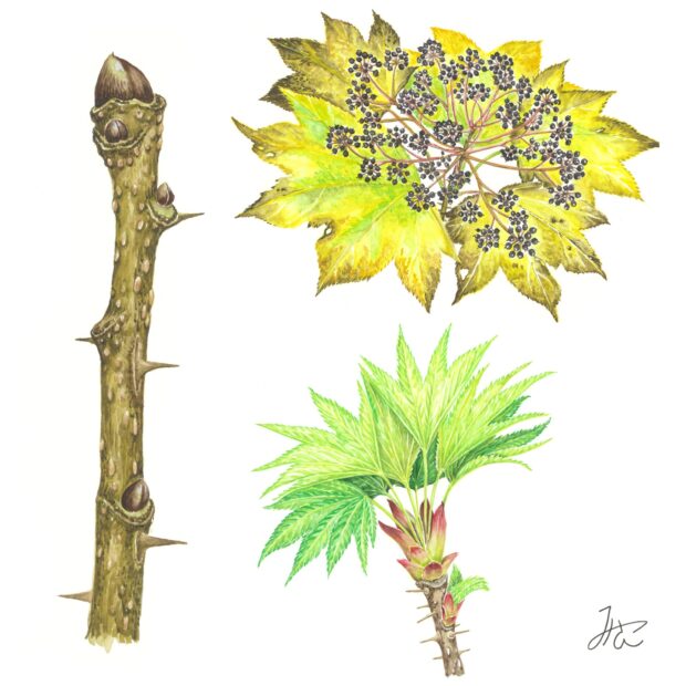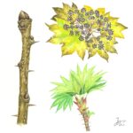 痛そうなトゲトゲの枝や幹が第一印象となる木ですが、 線香花火が思い浮かぶような花や実を付け、 可愛らしい一面もある木です。 北から南まで広い地域で生きていける強い木でもあります。