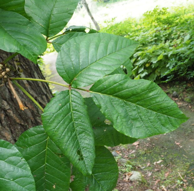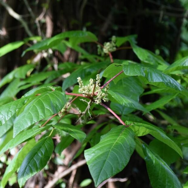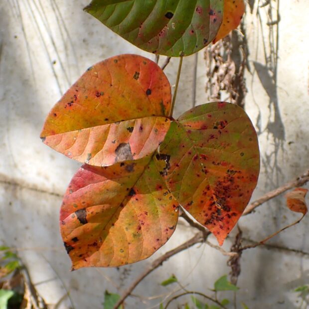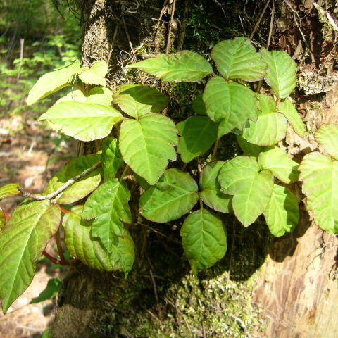 ウルシの仲間の中では一番かぶれるので、 よく覚えましょう!直接木の汁に触らなくても、 そばで草刈りなどをしているだけで、 かぶれることがあります。 3枚一組のつたの葉にはご注意を‼