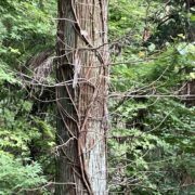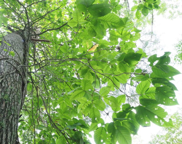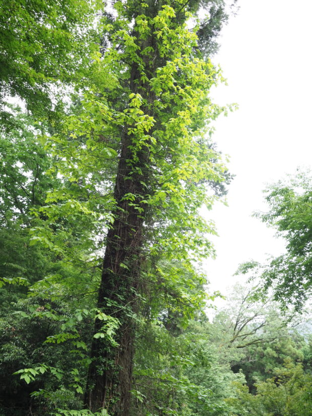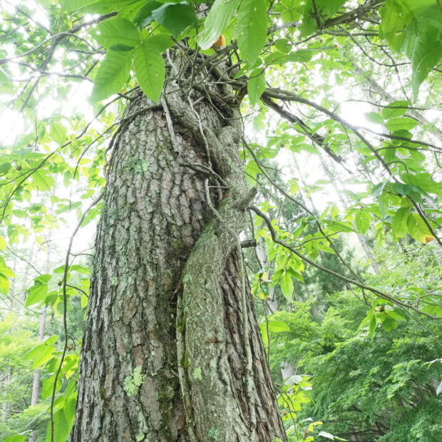 つるから細い根を出して他の木の幹によじ登ります。 日の当たる上の方へと伸びていき、 葉を広げます。