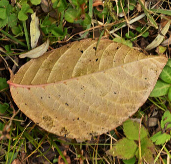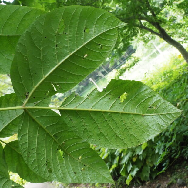 三枚セットの葉っぱです。 卵形の葉っぱですが、 先っぽがツンととがります。 秋には真っ赤に色づき、 山を美しく彩りますが、 葉をちぎって出る白い液にふれるとかぶれてしまうのでご注意ください。