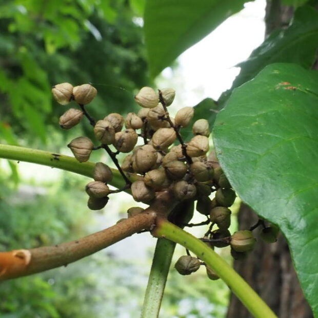 こげ茶色の縦の筋がある実の外側は、 短い毛の生えた皮に包まれています。 8~9月に熟すと皮は剥がれ落ち、 縦の筋が目立ちます。