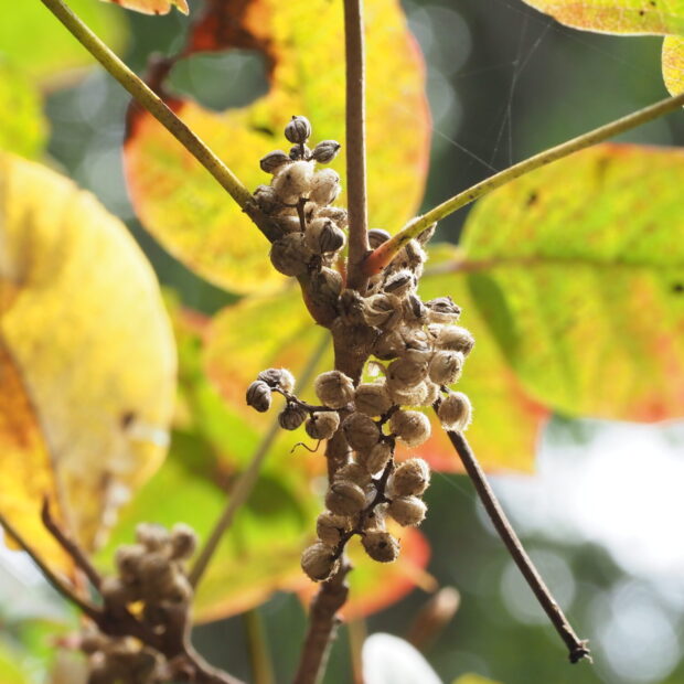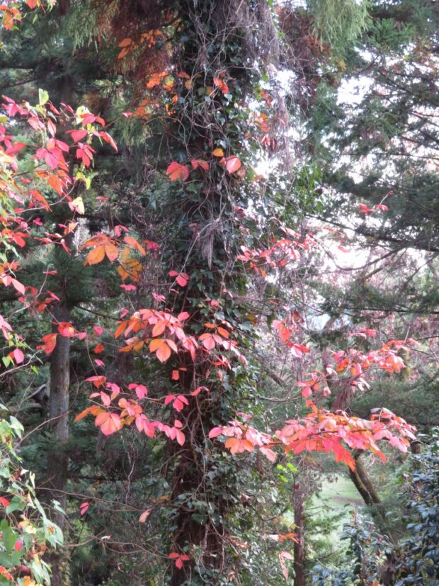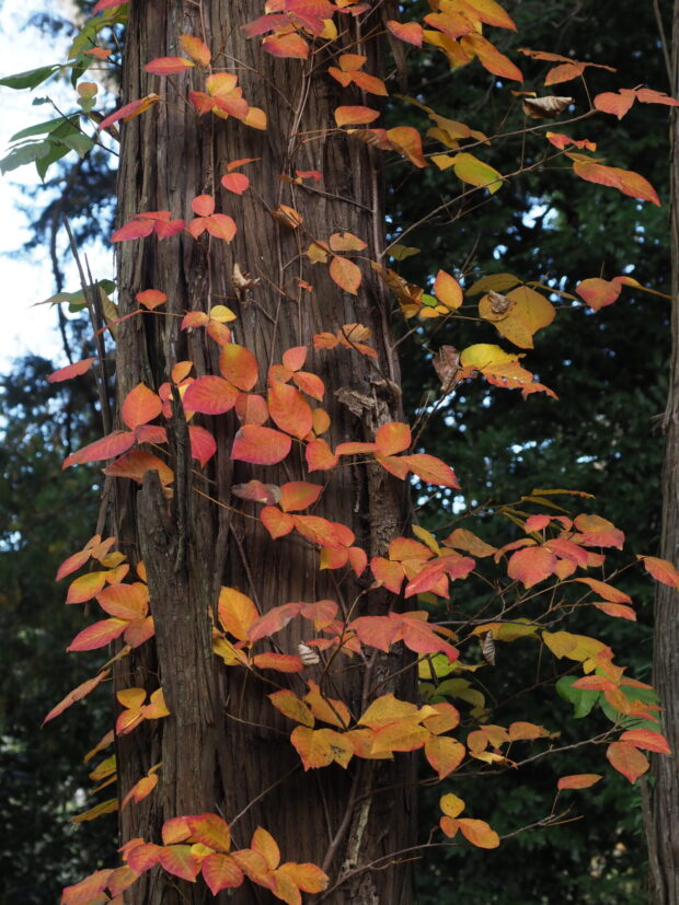 秋の紅葉では美しく目立ち、 そしてつるを伸ばしてどんどん増える木です。 かぶれるからと切るのに迷っていると、 あっという間に広がっていきます。 なかなかの策士で世渡り上手です。