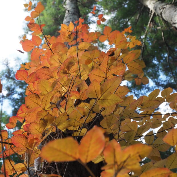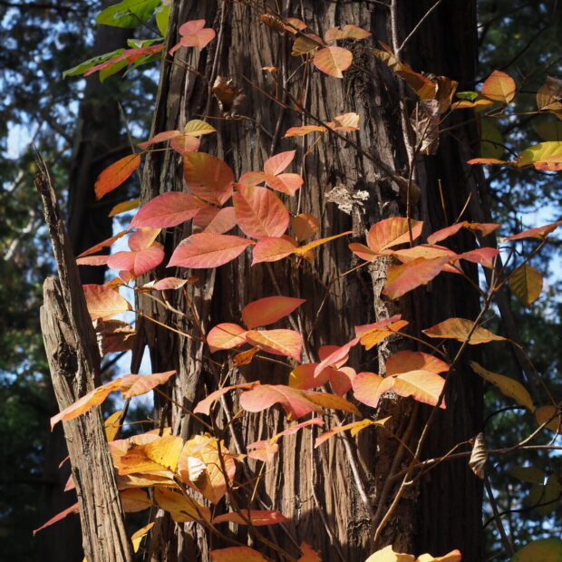 真っ赤に色づく紅葉は山で一、 二を争う美しさです。 三枚セットの葉も可愛らしいですが、 見かけに反して葉やつるを折ると出てくる白い液は、 ひどくかぶれるので遠くから見守りましょう。