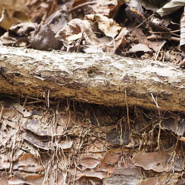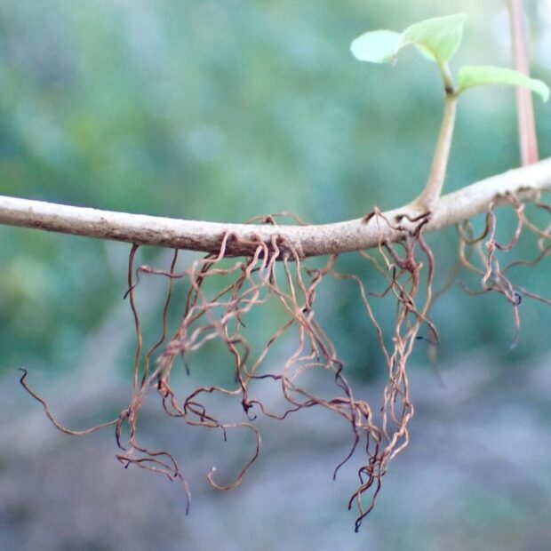 気根(きこん)という根を他の木にくっつけて登ります。 つるを太くして力強くからみ付き、 高い木でもてっぺんまで登ります。