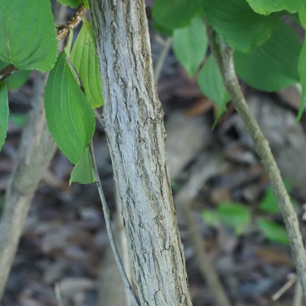 樹皮は灰褐色です。 薄くはがれて、 縦に深い皺(しわ)が入ったように見えます。