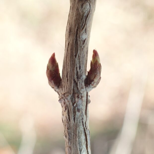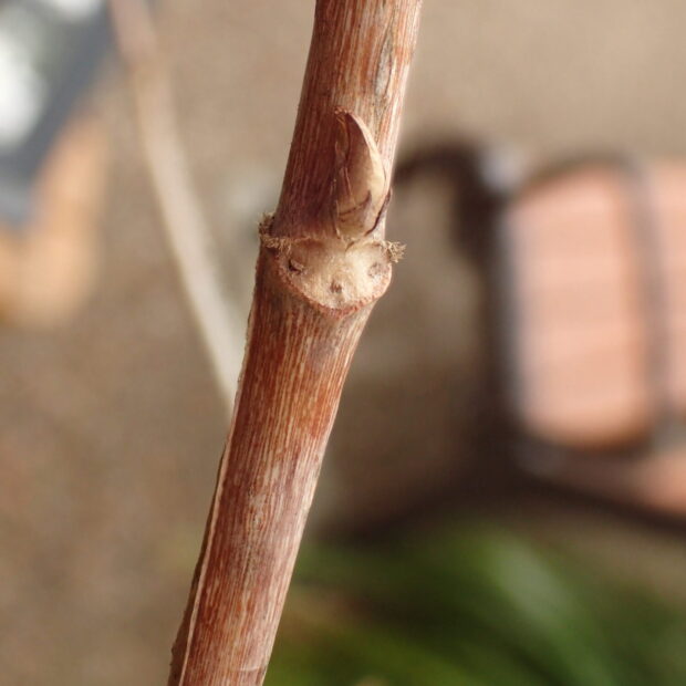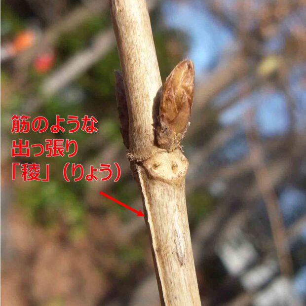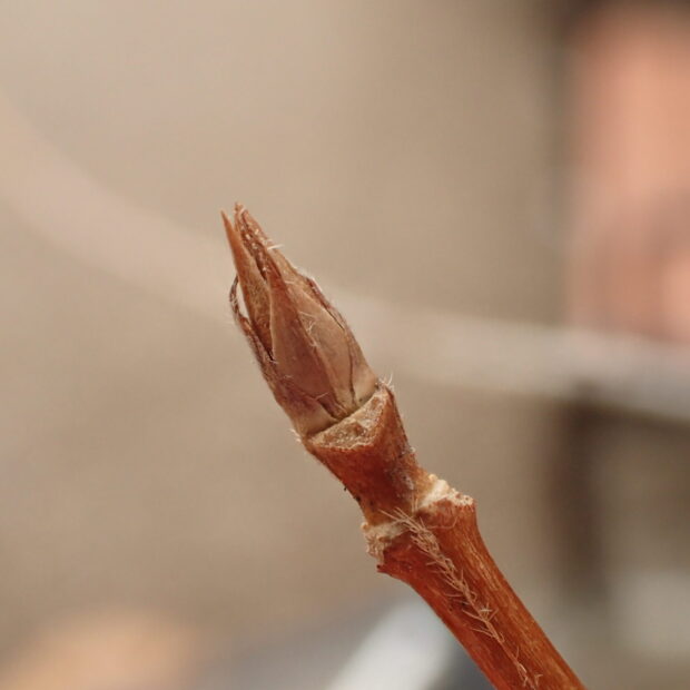 とがった爪のような形で、 何枚もの芽鱗に包まれています。 葉痕の維管束痕は3つで、 いろいろな表情のお顔が見られます。