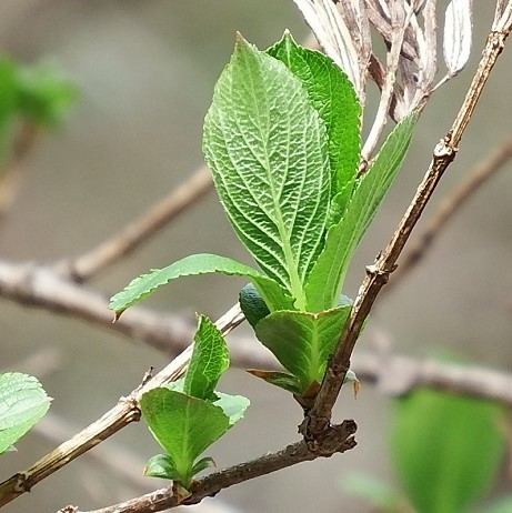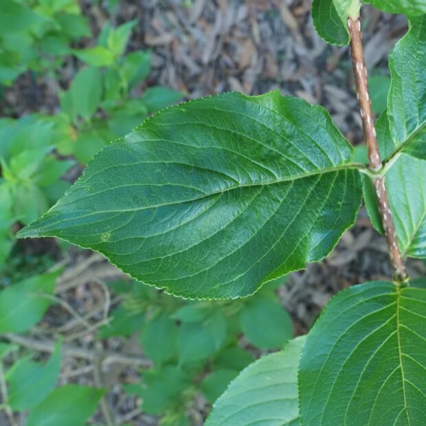 葉は対生。 長さは6~16㎝。 先端は鋭くとがり、 縁には細かいギザギザがあります。