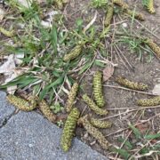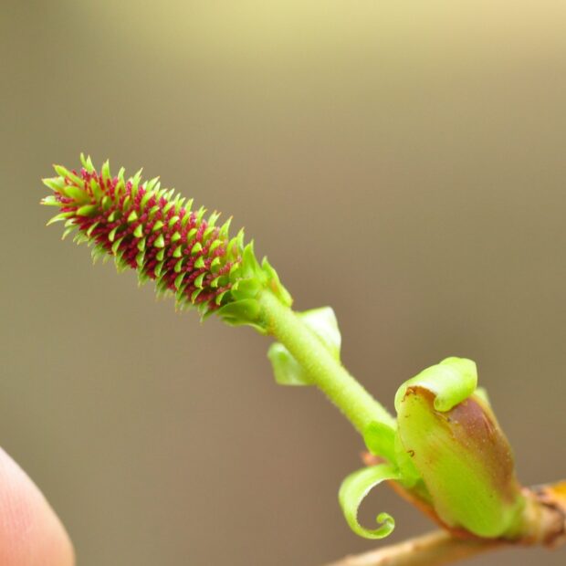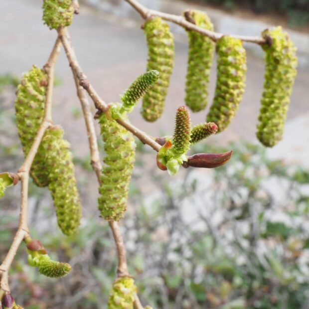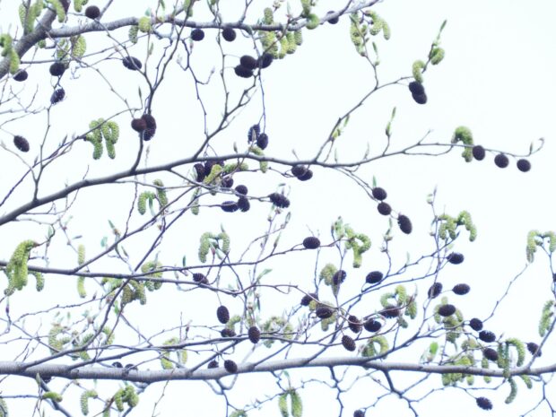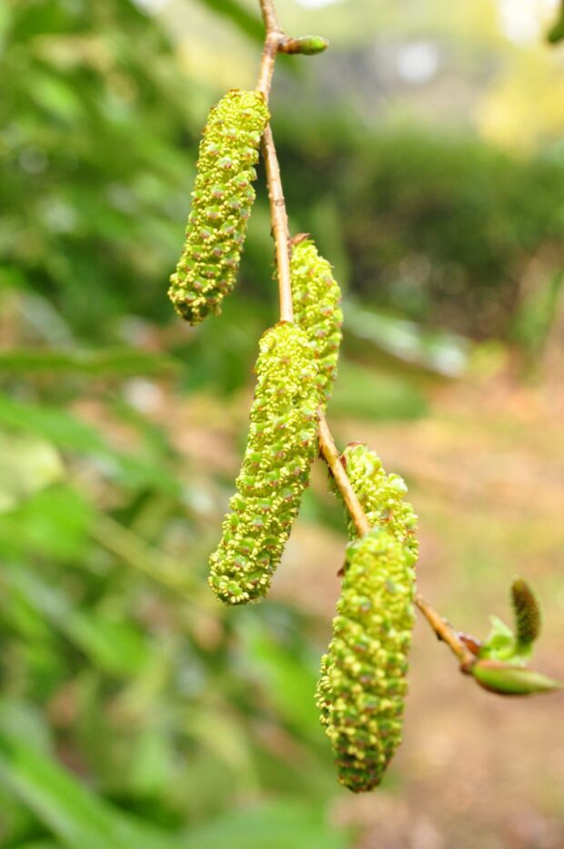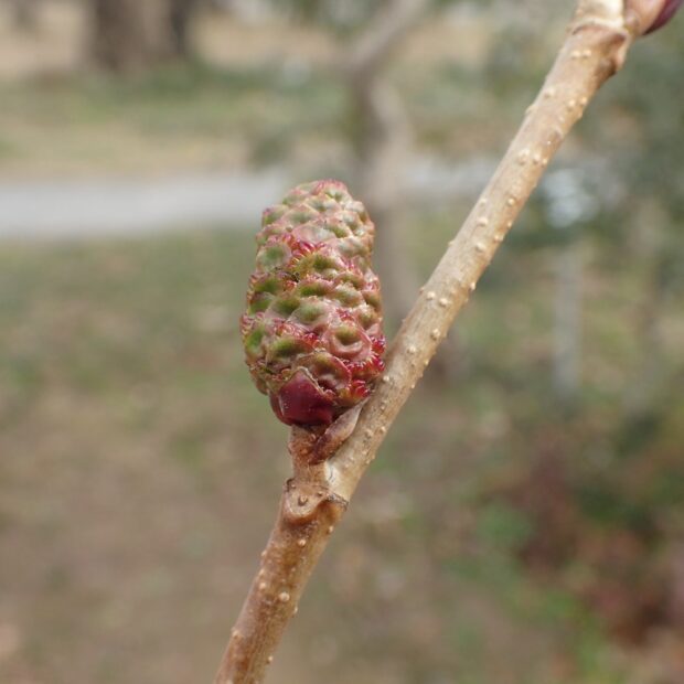 早春、 葉が出る前に緑色の花が咲きます。 雌花は枝の先に上を向いて咲きまます。 雄花は4~6㎝程で太く垂れ下がります。 雄花から花粉が風にのって運ばれます。 この花粉は花粉症の原因にもなると言われています。