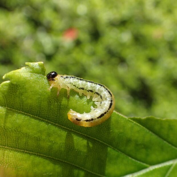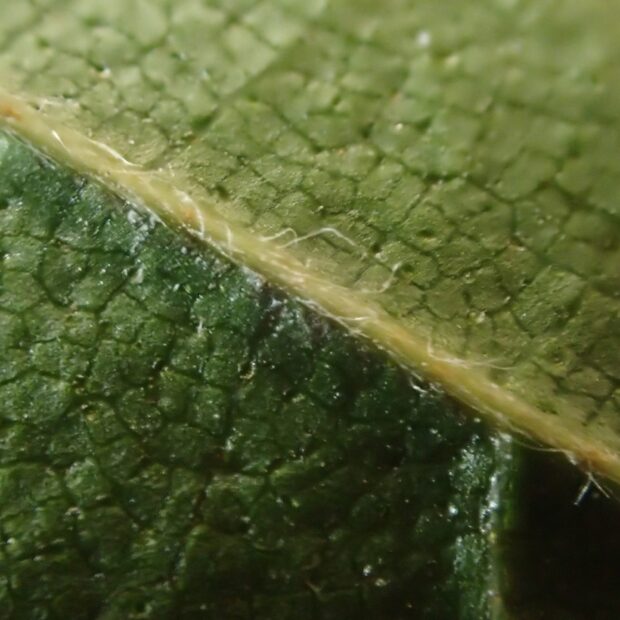 先端は鋭く尖り縁には細かいギザギザ(鋸歯・のこぎりば)があります。 表面は脈が13~17対あり、 凹凸が目立ちます。