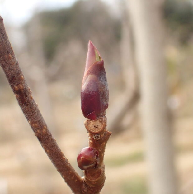 先がとがっていて赤みのある芽鱗に包まれている芽が、 目を引きます。 葉痕の維管束痕は3つで、 すやすや眠っているようなにっこり顔があります。