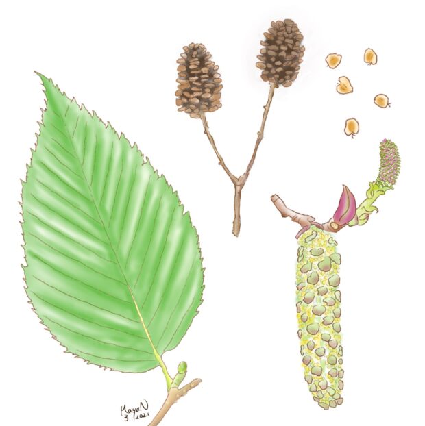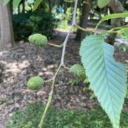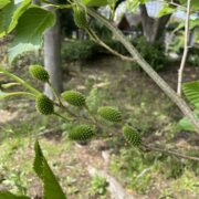 その名の通りヤシャブシよりも葉が大きいのが特徴です。 小さな松ぼっくりのような実がなりますが、 マツとは全く違う種類の木です。 荒れ地や造成されたばかりの場所で、 すばやく成長します。 その性質からパイオニアツリー(=開拓の木)と呼ばれます。 成長は早いのですが、 じつは寿命は10~50年と木の中では短いです。