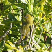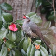 蜜がたっぷりある花にはメジロやヒヨドリがやって来ます。 くちばしを花粉だらけにして受粉の手伝いをしています。
