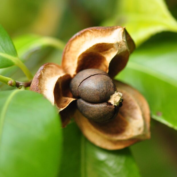 ヤブツバキの実の中には大きな種6~8個入っています。 ツバキの種から椿油がとれます。 椿油は髪を整える整髪剤や食用として使われてきました。