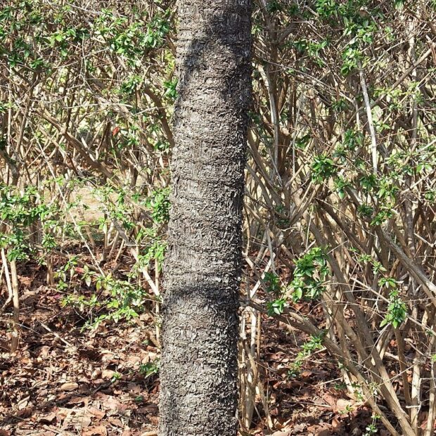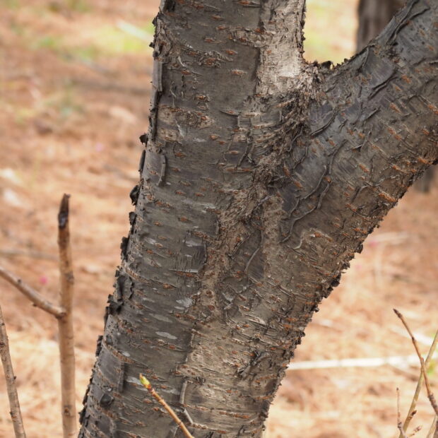 高さ8mくらいまで大きくなります。 樹皮は黒っぽくなり、 樹形に目立つ特徴はでません。
