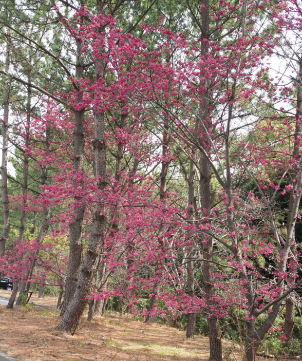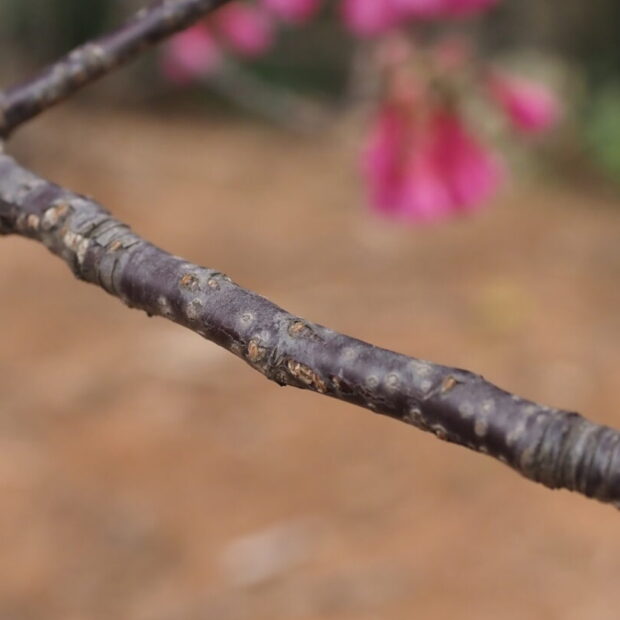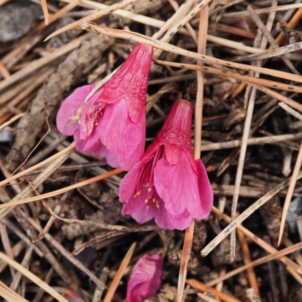 早春から春、 葉が出る前に濃いピンク色の花を咲かせます。 あまり開かず、 2~3個がまとまって下向きに付きます。