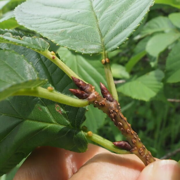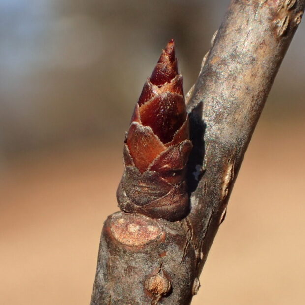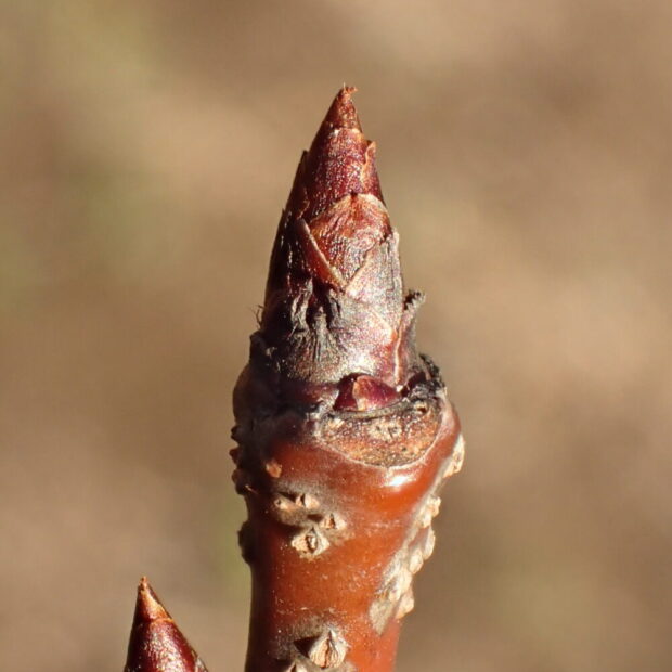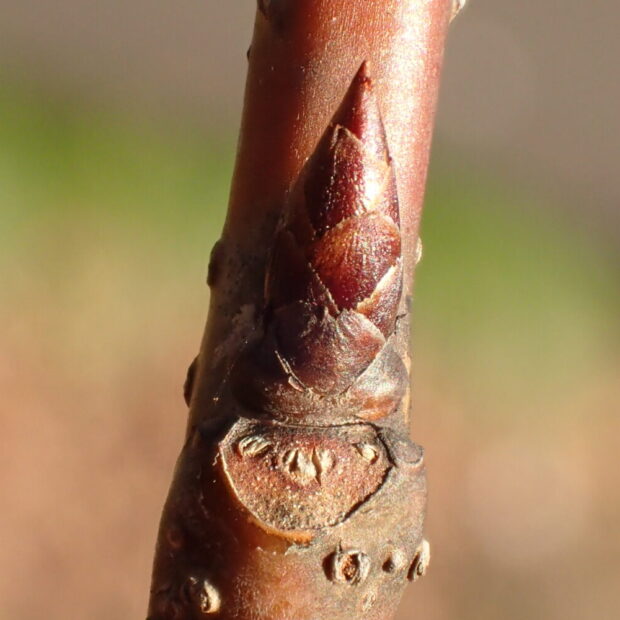 濃い赤茶色のとんがり帽子の冬芽です。 葉痕のお顔は、 ちょっと日焼けした感じのふくよかなお顔です。 ★冬芽は明るい褐色で毛はありません。