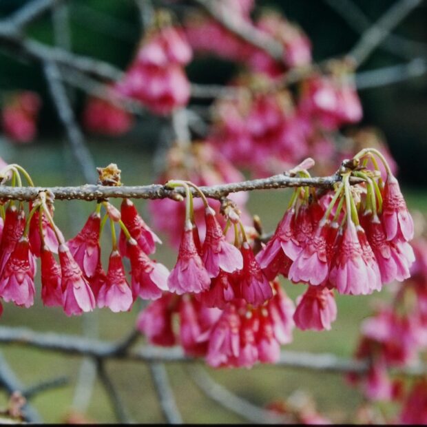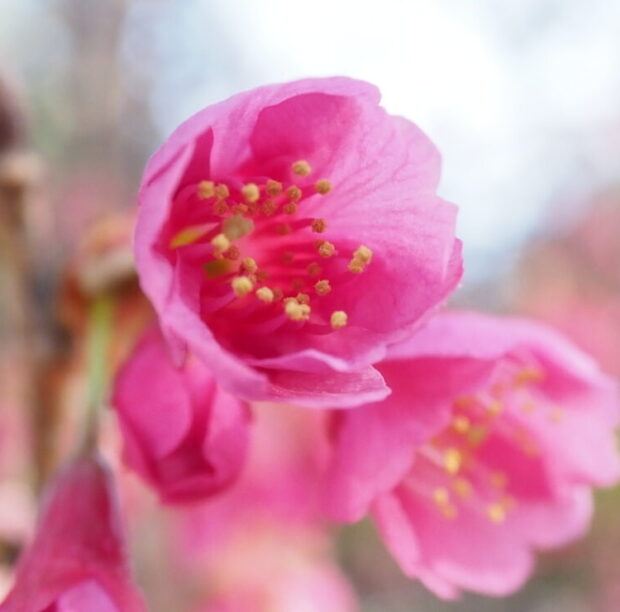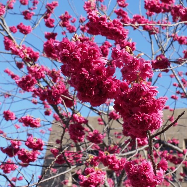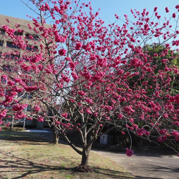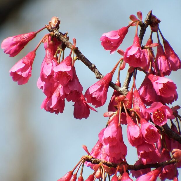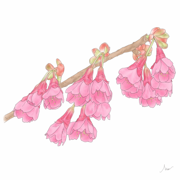 早春の寒い時期に咲く緋色(濃いピンク色)の花の桜なので「緋寒桜(ヒカンザクラ)」と呼ばれていましたが、 彼岸桜(ヒガンザクラ)と発音が似ていて紛らわしいためカンヒザクラと呼ぶようになりました。