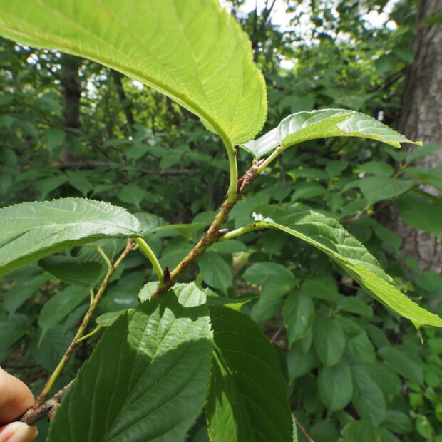 細長い楕円形でギザギザは小さく、 葉先側に曲がります。