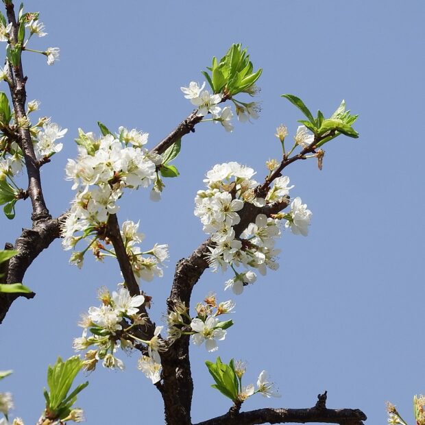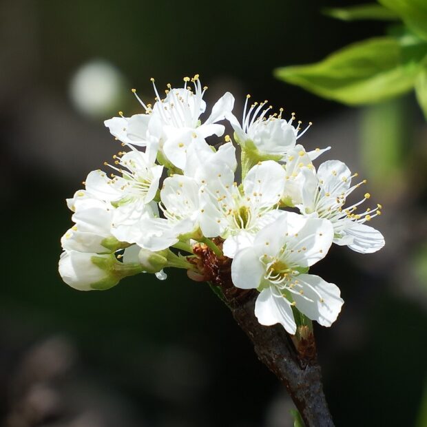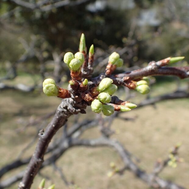 春、 葉が開くと同時か少し遅れて白い花が咲きます。 1個の花芽から3つの花が咲き、 枝全体が花束のように見えることから「花束状短果枝」と呼ばれます。