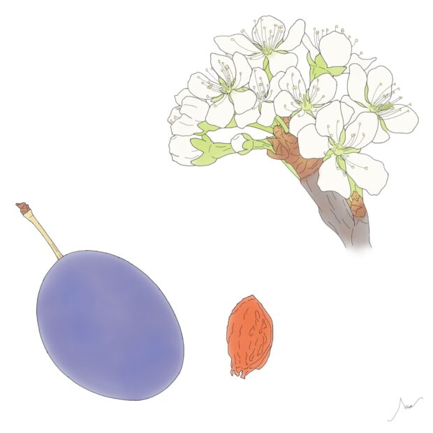 セイヨウスモモの起源には諸説あるが、 現在はスピノサスモモとミロバランスモモの雑種だと推定されています。