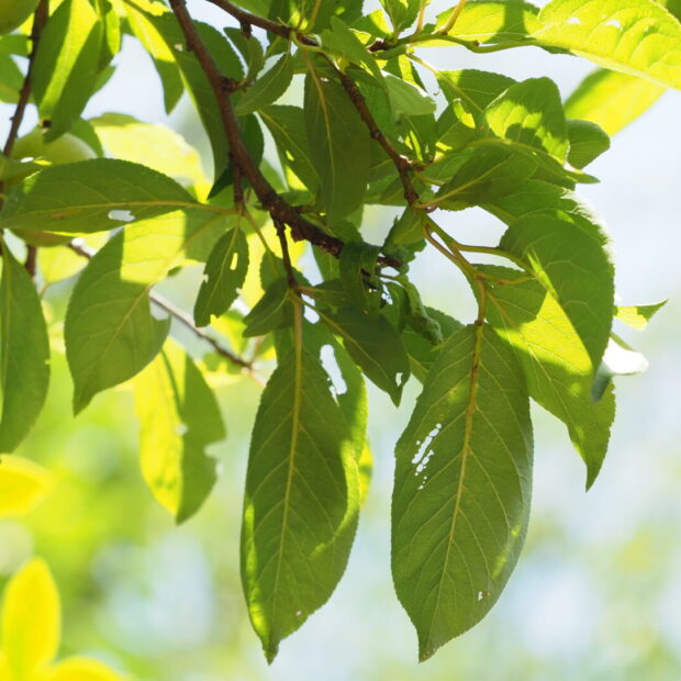 鈍いギザギザがある互生の葉っぱです。 スモモの葉より小さめで厚く、 光沢があります。 柄の上部にはイボ状の密腺が1対あります。