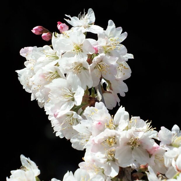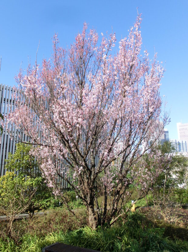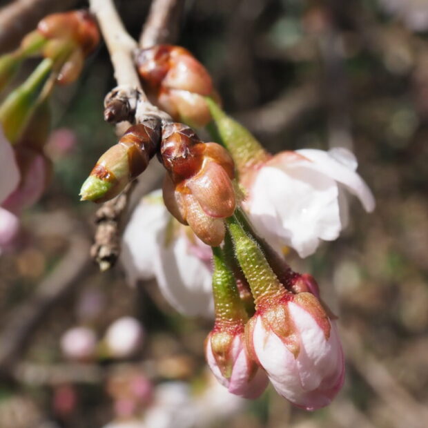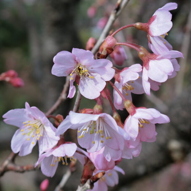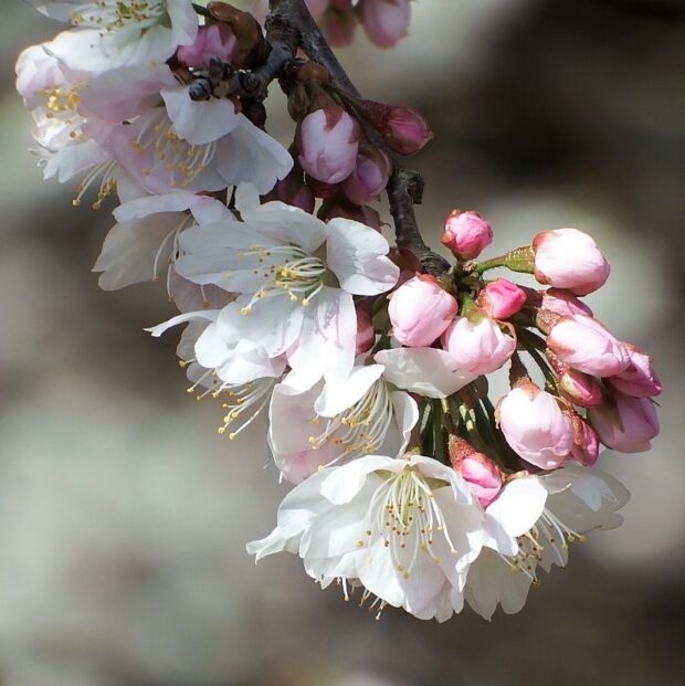 中国原産のシナミザクラと日本原産のコヒガンから生まれた園芸品種です。 早春の関東ではお彼岸の前に小ぶりの花をたくさん付けて見栄えが良いので、 切り枝としてお花屋さんで売られています。
