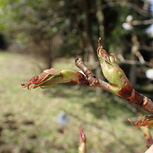 ソメイヨシノより小さく、 毛が無くて赤茶色で光沢があります。 葉痕にはほっこりした感じのお顔があります。