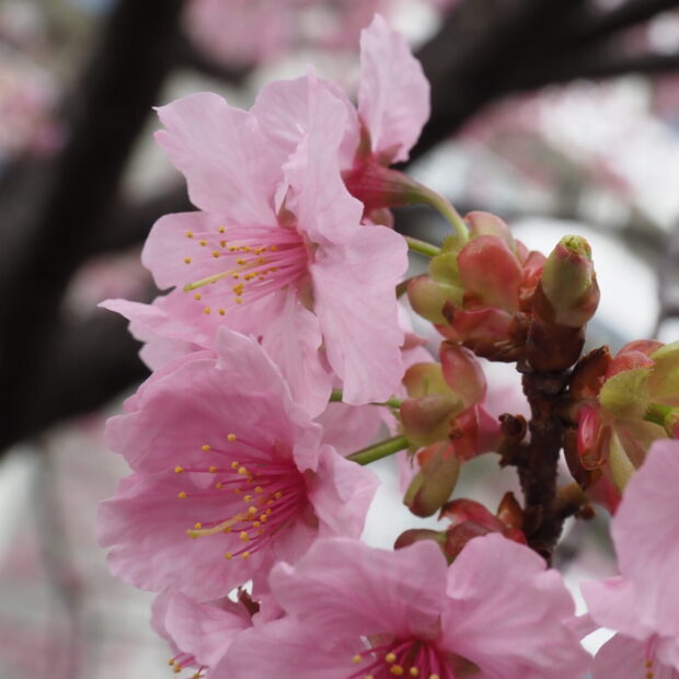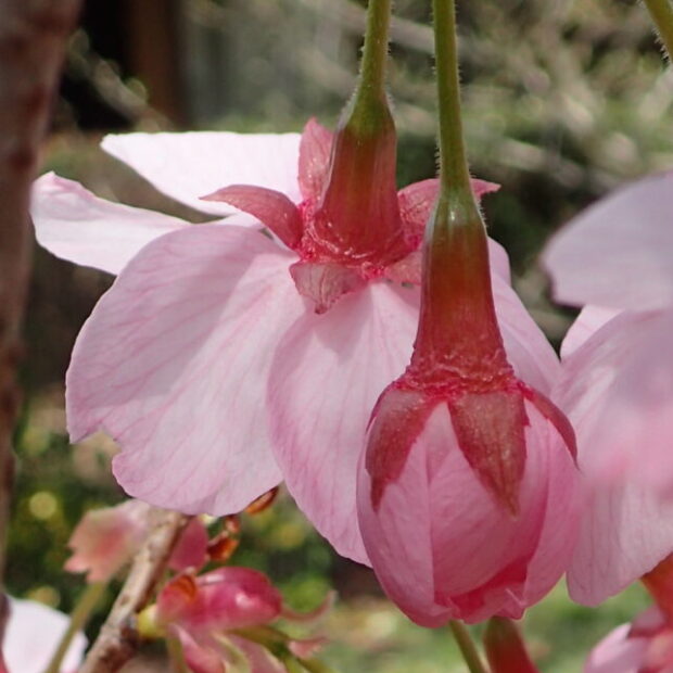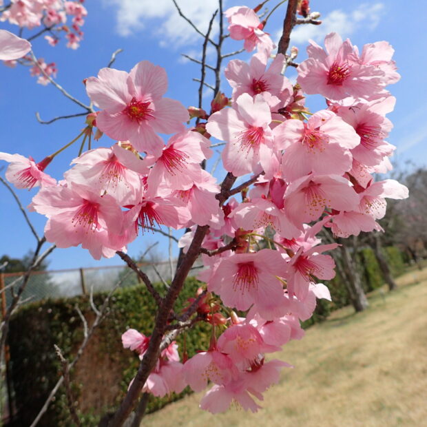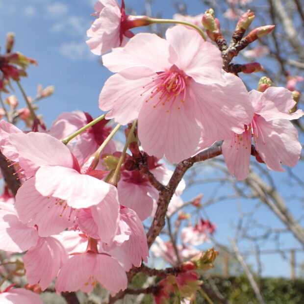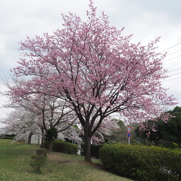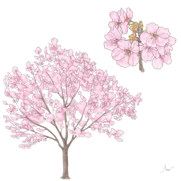 静岡県にある国立遺伝学研究所でソメイヨシノと似た桜を作り出すために、 オオシマザクラとエドヒガンを交雑させて作ったアマギヨシノと、 野生種のカンヒザクラを掛け合わせて作られた園芸品種です。 暑さ寒さに強く、 花色はカンヒザクラの影響で紅色が濃く、 カワヅザクラに似ています。