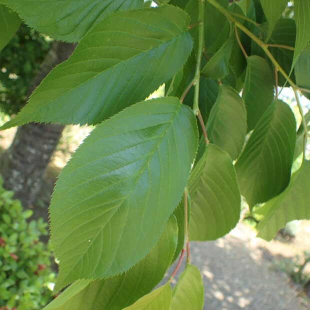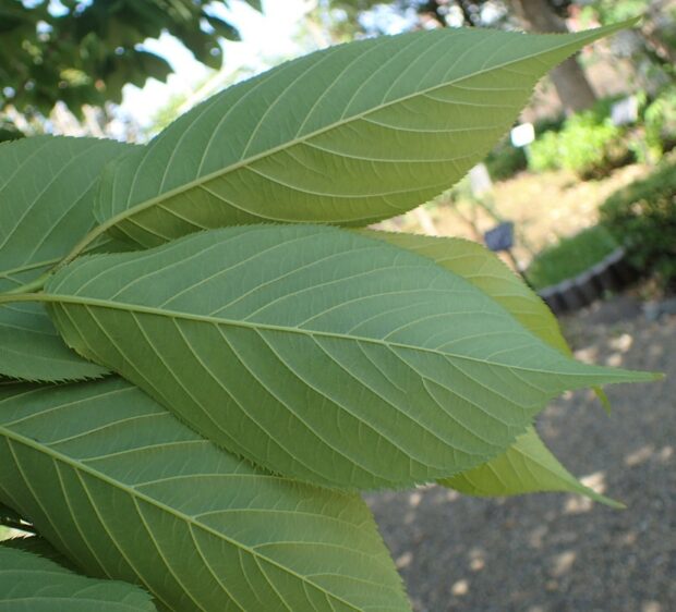 長楕円形で先端はとがり、 ギザギザは細かくそろいます。