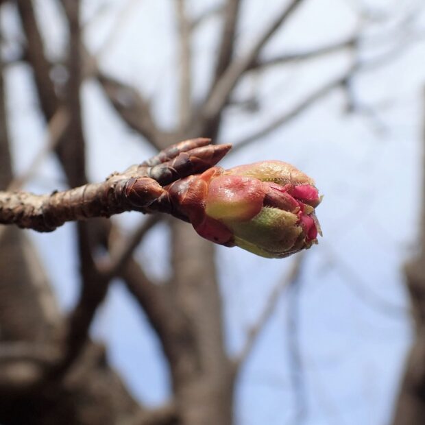 オオシマザクラの冬芽に似ていて、 つややかな茶色っぽい芽には少し毛があります。 花が咲いていないときは、 葉痕のお顔を楽しみましょう。