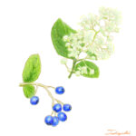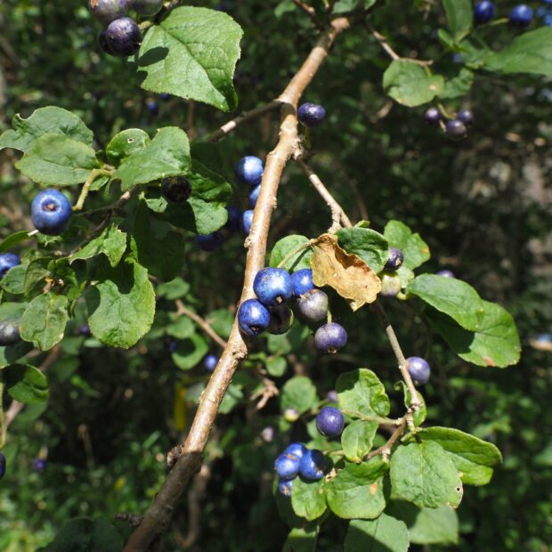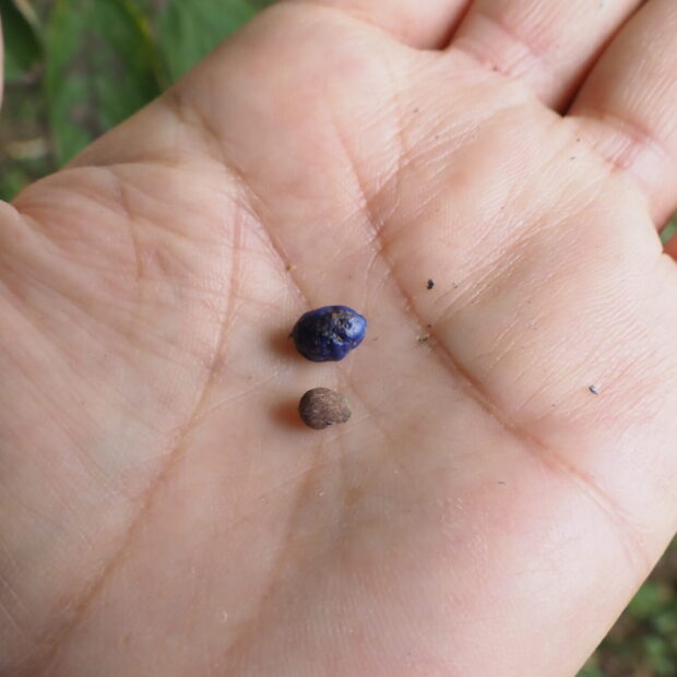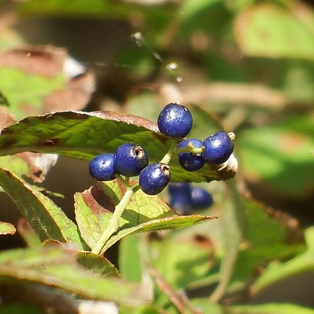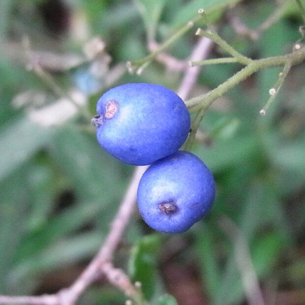 ゆがんだ卵形の小さな実で、 秋に熟して青色になります。