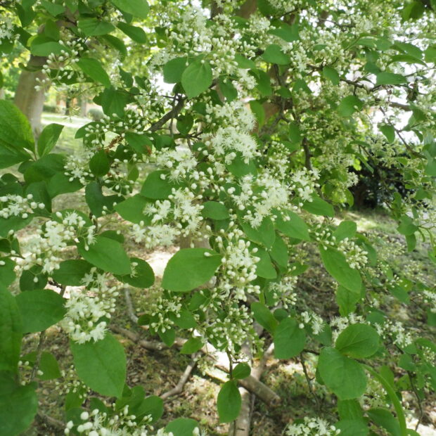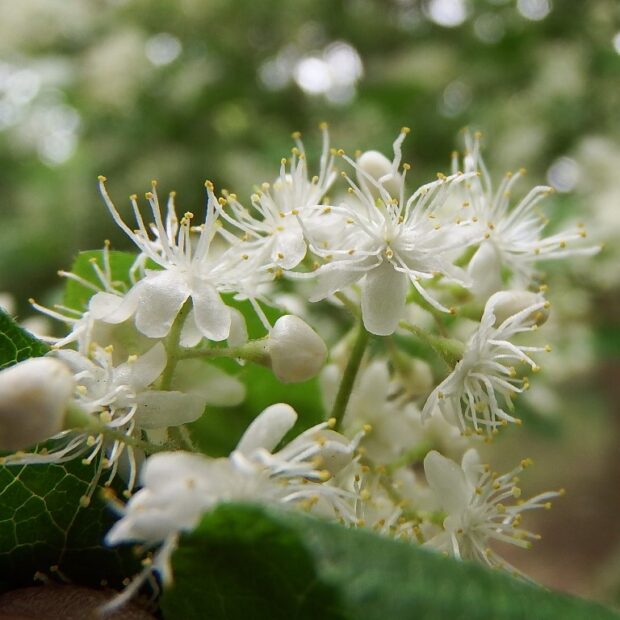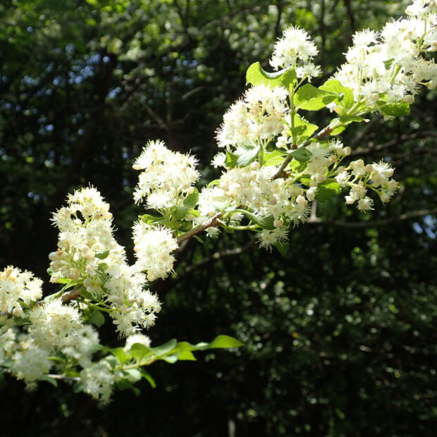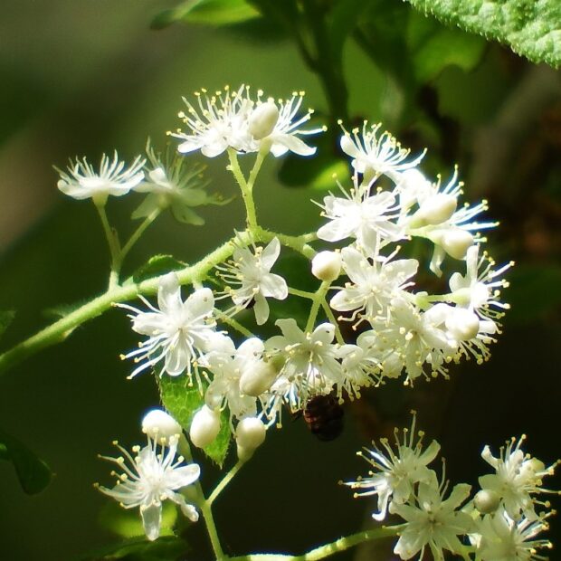初夏、 枝先に小さな花をたくさん咲かせます。 花びらは5枚で1本の雌しべの周りにたくさんの雄しべが付きます。