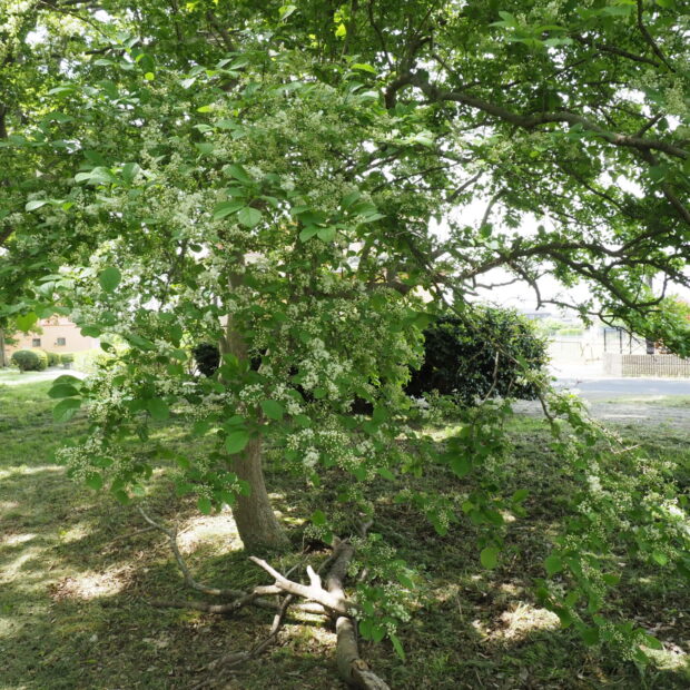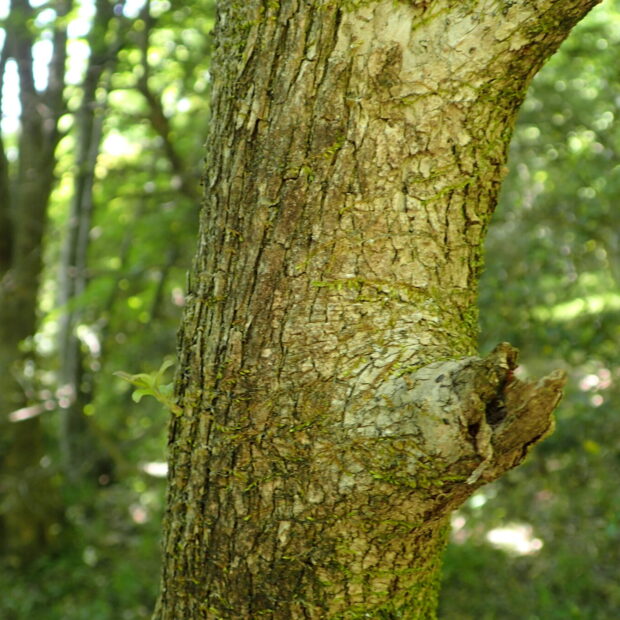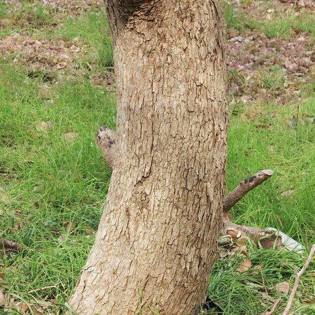 灰色がかった茶色の幹で、 縦に細かく裂けます。