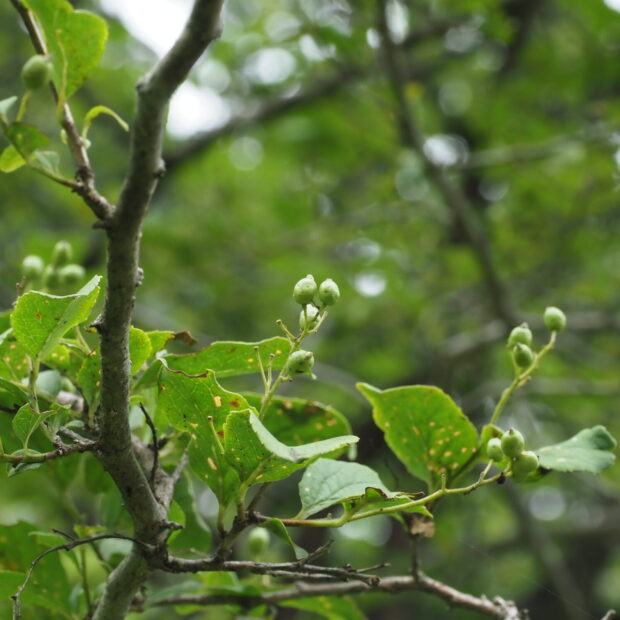 高さ2~4mほどになります。 細い枝を多く出し、 樹形は乱れやすいです。 白い花や葉の雰囲気が似ているカマツカやアオハダで見られるような短い枝はありません。