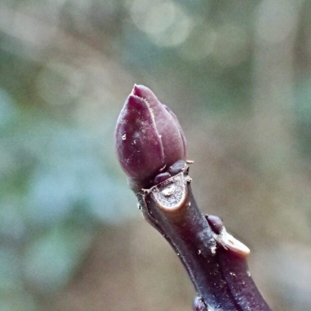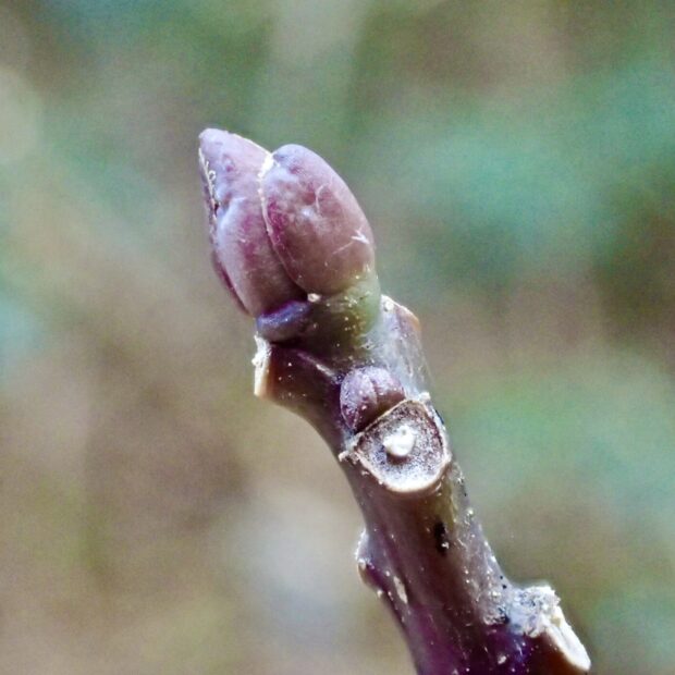 枝と同じような緑色〜紫がかった緑色をしている芽鱗が、 2〜3枚ほど見えます。 半円形の葉痕には、 少しカーブした維管束痕が1つあります。