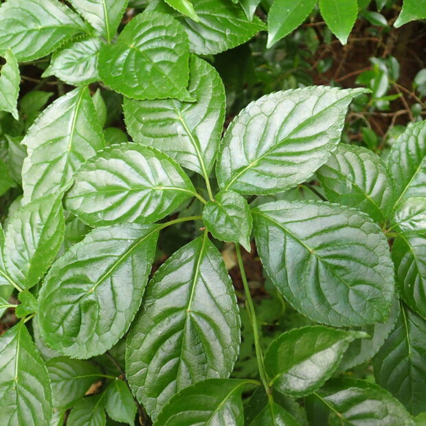 真ん中に花や実が付く広い楕円形の葉っぱが互生に付きます。